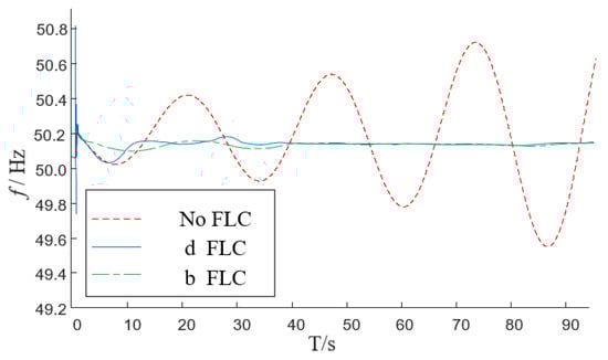 To validate the effectiveness of the proposed approach, an N−1 fault is induced in the critical AC2 transmission line. Three simulation scenarios were conducted to observe the system frequency variation curves. The scenarios included without FLC in the DC system, with FLC implemented in DC project d, and with FLC implemented in DC project b. The results are illustrated in