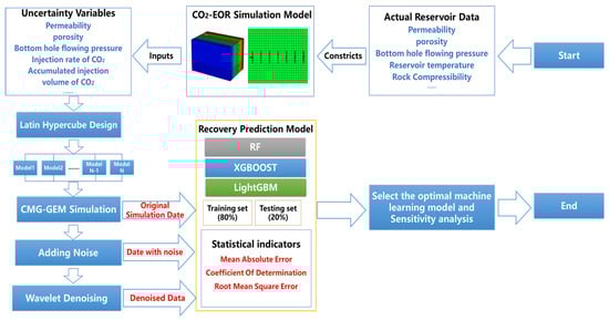 In contrast, machine learning (ML) methods offer a distinct advantage. They can create unique predictive models that consider various reservoir characteristics, uncover hidden data relationships, and accurately predict production outcomes at a lower cost. In the petroleum industry, ML models have been widely applied and achieved good application results. In the petroleum industry and underground gas storage, machine learning has found application in a myriad of areas, including the evaluation of reserves in both conventional and unconventional reservoirs [,,,], the automated interpretation of well tests [,,,], forecasting production from oil and shale gas [,,,], as well as in predicting the lithology of reservoirs [,,]. ML models have also been utilized in research for enhanced oil recovery (EOR). Van Si et al. [] developed an artificial neural network (ANN) model designed to forecast the oil recovery factor (ORF) specific to CO2-enhanced oil recovery (EOR) processes. Cheraghi et al. [] suggested employing deep ANN and random forest (RF) models for identifying the most appropriate EOR techniques, leveraging data sourced from oil and gas publications. Esene et al. [] conducted predictions of the ORF using ANN, least-squares support vector machines, and gene expression programing for carbonate water-injection processes. In another study, Pan et al. [] constructed a machine learning model utilizing extreme gradient boosting (XGBoost) to infer reservoir porosity from well log data. They enhanced the XGBoost model’s accuracy through a combination of grid search and nature-inspired optimization methods, achieving a root mean square error (RMSE) of 0.527. Further extending the exploration of machine learning applications, Huang et al. [] evaluated the performance of ANNs, light gradient boosting machine (LightGBM), and XGBoost models in forecasting production from steam-assisted gravity drainage processes. Collectively, these investigations underscore the significant capabilities of machine learning models in forecasting the oil recovery factor and enhancing oil recovery methodologies. Compared to traditional methods of predicting recovery rates, ML can deeply mine the relationship between complex data and recovery, extract data features to identify the main controlling factors affecting recovery rates, and efficiently, accurately, and cost-effectively predict the recovery rates of reservoirs under different geological conditions. While previous research has explored machine learning (ML) models, their application in the rapid prediction of CO2 flooding systems in tight oil reservoirs has not been extensively studied. Given the difficulty of accurately simulating underground fracturing conditions in laboratory settings and the associated high costs, the majority of recent studies have turned to numerical simulations to gather data. However, these studies frequently neglect the effect of data noise on their outcomes, potentially leading to variances between the research conclusions and real-world scenarios.