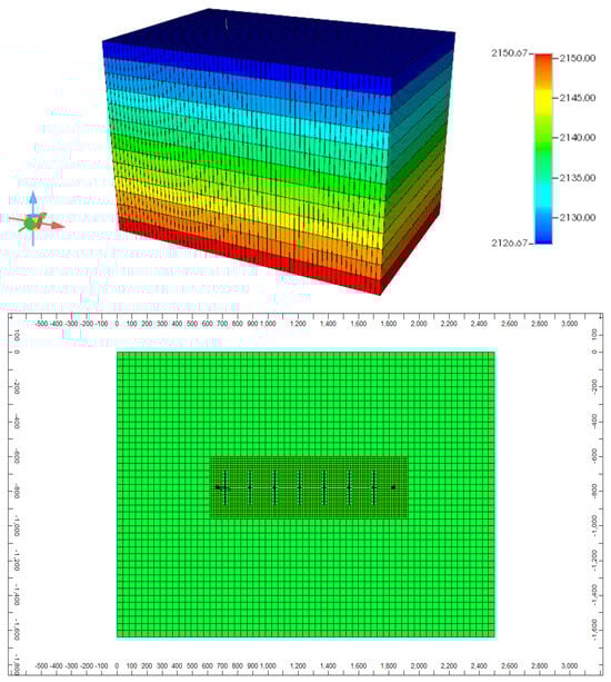 Changqing tight reservoir, ideal for CO2 miscible flooding due to its vast area and access to substantial gas resources, is the chosen site for CO2 injection. The project is further supported by favorable on-site road conditions. To model the CO2 injection process accurately without the influence of reservoir boundaries, we employed CMG-GEM numerical simulation software to create a simulation model. This model features a single-well radial grid layout measuring 2440 m × 1640 m × 26 m, covering 4 km2. Utilizing the Cartesian grid system, the formation is divided into regular grids: 61 in the I direction, 41 in the J direction, and 13 in the K direction, with standard grid sizes of 40 m × 40 m × 2 m. The central encrypted grid is finer, with dimensions of 8 m × 8 m × 2 m. Figure 2 showcases the model’s 3D distribution and grid layout.