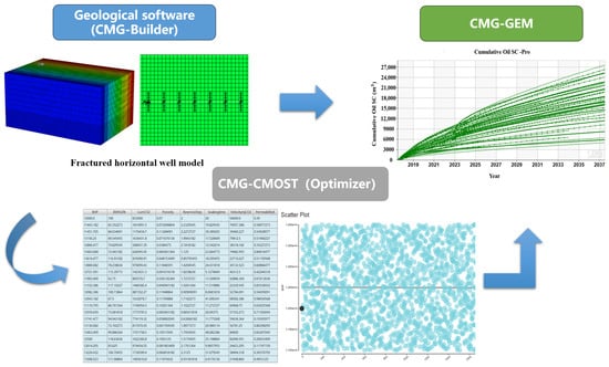 To achieve this, the study gathered a large dataset through the definition of uncertainty variables and the application of Latin hypercube sampling, guided by previous sensitivity analyses that highlighted key factors in the EOR-CO2 process [,,,,]. Consequently, nine parameters were selected for detailed analysis: porosity (Por), permeability (Perm), reservoir thickness (Thickness), fracture half-length (FHL), bottom hole flowing pressure (BHP), injection rate of CO2 (CO2-INJ), cumulative injected CO2 mass (CO2-CMASS), soaking time (SOAK-T), and number of fractures (Numfrac). Based on the nine selected influential factors and using the parameter ranges provided in Table 2, Latin hypercube sampling (LHS) was applied to sample these nine parameters, resulting in 4090 data samples. And a new reservoir model was generated based on these 9 parameters. The CMOST optimization tool facilitated parallel computing to calculate the reservoir recovery rate 10 years later. It will take 16,360 min to obtain the calculation results of these 4090 models in this study. The integration of Builder and CMOST allows for the simulation of different geological implementations, as illustrated in Figure 4.