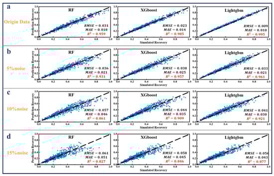 After adjusting the hyperparameters of the three machine learning models for ORF prediction (as presented in Table 4), we evaluated each model’s performance across diverse noise levels. Figure 8 shows that an increase in the noise ratio is associated with a discernible decline in the accuracy of the machine learning model’s predictions for recovery. Figure 8a demonstrates that, at a 5% noise level, the correlation coefficient between predicted and measured ORFs from test data predominantly aligns with the fitted line (slope = 1), indicating accurate predictions by RF, XGBoost, and LightGBM (R2 > 0.95). In Figure 8b, the RF model’s R2 significantly drops to 0.891 at a 10% noise level from 0.954 at 5% noise. However, XGBoost and LightGBM maintain strong accuracy (R2 > 0.91). Figure 8c depicts that, at a 15% noise level, all models exhibit R2 values below 0.87, RMSE values exceeding 0.055, and MAE values surpassing 0.043.