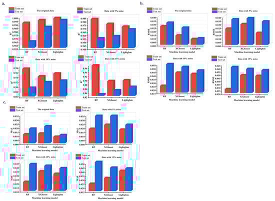 The statistical performance of the ML models under different noise levels: (a) R2, (b) RMSE, and (c) MAE.