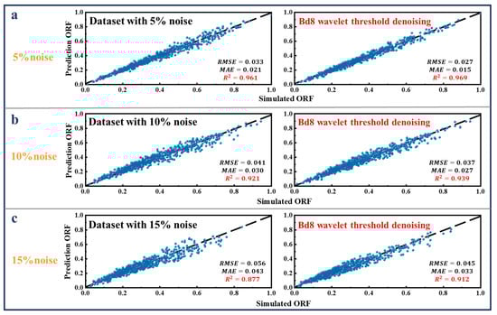 The data obtained from numerical simulations are typically free from noise interference but, in real-world measurements, data noise is unavoidable. Previous studies, Sun and Thanh et al. [,], have used numerical simulation data for machine learning models to evaluate CO2 storage capacity and effectiveness. However, they did not consider the presence of noise in on-site data. To simulate the presence of noise in on-site data and enhance the generalization of the trained machine learning model in this study, we introduced different levels of noise using the method described in Section 2.1.3. Subsequently, we performed the denoising processing (Section 2.1.3) to investigate the impact of noisy data and denoised data on the prediction results of ORF.