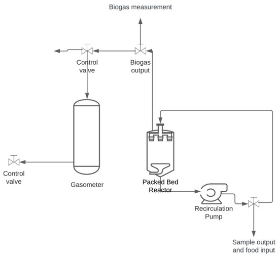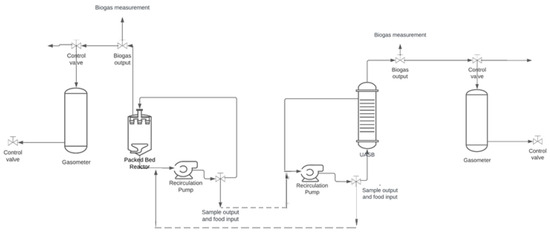 Anaerobic digestion is a process in which organic matter is converted into methane (), carbon dioxide (), and hydrogen () via the action of a bacterial consortium [12]. The process undergoes three phases: hydrolysis, acidogenesis, and methanogenesis [13]. In the first phase, organic matter is broken down into smaller molecules. In the second phase, acidogenesis, volatile fatty acids (VFAs) are produced. And finally, and are produced by methanogenic bacteria [14]. It has been shown that when anaerobic digestion is carried out in a single phase, high levels of VFAs can build up, which can lead to a decrease in pH and in the inhibition of methanogenic bacteria [15]. The physical separation of the formation of organic acids, , and can significantly improve the metabolic activity of microorganisms in these processes. Employing a cascade of two individual biodigesters, where the output of one feeds the other, can effectively achieve this. The first biodigester produces organic acids and traces of and , while the second biodigester primarily produces and [16].