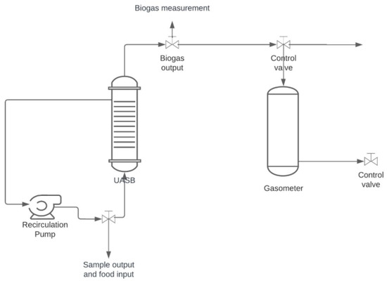 The methanogenic reactor was built with PVC with the following dimensions: diameter 7.62 cm, height 60 cm, total volume 2.5 L, and useful volume 2 L (Figure 2). It was inoculated with a mixture of activated sludge from a WWTP (wastewater treatment plant) active in Bogotá and kept at a temperature of 30–35 °C by means of a water bath. Synthetic wastewater (SW) was used, as mentioned [26]. The biogas obtained in this unit passed to a 2 L gasometer through which the determination of the daily volume was carried out. An Iwaki magnet pump (centrifugal magnetic drive pump) was used to maintain a rate of 11 to 12 [18]. The operation of the UASB reactor had an adaptation time of four weeks with an initial OLR (organic load rate) of 4.0 kg COD () and a final OLR of 5.5 kg COD () after 10 days. This parameter was kept constant for coupling packed bed and UASB reactors (Figure 3). To maintain a constant organic loading rate in the UASB reactor, the system was coupled by taking an aliquot with known COD and calculating the corresponding volume. The system was then manually measured and fed daily. The research work carried out by Pererva [27] was taken as a guide for the construction of the reactors.