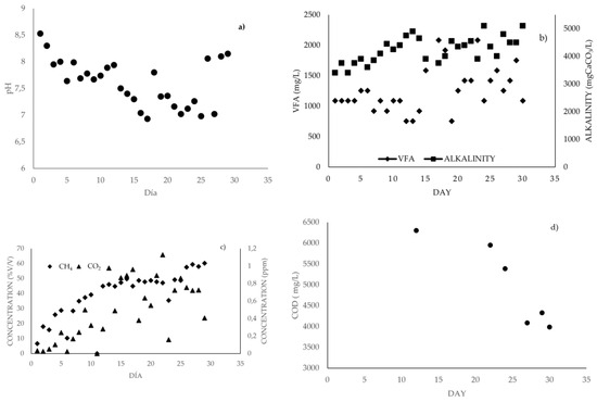 Figure 4a provides evidence that in the acclimatization period, the pH remained in the range of 6.5 to 8, which is similar to that reported by [36], without exceeding the pH limits where it is reported that at pH higher than 8.0 and less than 6.0, there is a sudden drop in the concentration of methane produced.