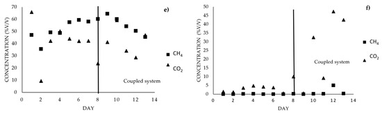 At the same time, in Figure 6d, a considerable decrease in COD is evident after having the system coupled due to the fact that a large part of the leachate generated in the hydrolysis reactor was transferred to the UASB reactor for its subsequent methanogenic process. This leads to the need for a greater amount of leachate to maintain the organic loading rate according to [45], until the transferred volume value exceeds 50% of the total volume of the 2 L UASB reactor and determines the end of the shell digestion process. As a consequence, a less aggressive reduction in the UASB was also noted, due to the fact that as the COD in the packed bed reactor was reduced, the UASB was fed. However, withdrawing more and more inoculum to be able to enter the leachates, which allows both reactors to be equalized in the mentioned control variables, is similar to that reported by [35]. Another trace compound could be present in the biogas mixture, according to [3], but was not measured.