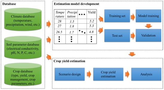 The cost of biodiesel is greatly influenced by the feedstock used to produce biodiesel [53]. Therefore, predicting feedstock yield is a significant factor for the efficient supply chain management of biodiesel. Figure 1 illustrates a general process of crop yield estimation model development via a machine learning algorithm. Since each machine learning algorithm requires observed data for its modeling process, most studies collect data (e.g., climate data, climate change data, soil parameter data, and crop data) from a field experiment. Remote sensors such as a thermometer and a photosynthetically active radiation (PAR) sensor can be utilized for the data collection [54]. Once the dataset is built, supervised learning is conducted to develop a yield estimation model for a certain crop. The validated machine learning model is used to estimate crop yield under a designed scenario (e.g., a climate change scenario), and researchers can analyze the estimated results.