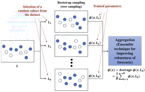 Figure 2 shows that RF generates bootstrap samples (i.e., ) from the original dataset L involving the independent variable x and dependent variable y. The bootstrap samples are used to train the individual decision tree , and the aggregation process in RF generates via Equation (3) to estimate the value of y [56]: