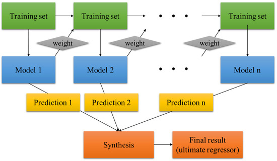 On the other hand, AdaBoost regression trains weight via multiple iterations with different sub-training datasets. Initially, a model has an equal weight as dataset D, and replace sampling is performed on D to obtain an adjusted weight with sub-dataset D1. This replace sampling continues until the best weight with the least value of a loss function is identified. Figure 3 illustrates the overall process of AdaBoost regression [59].