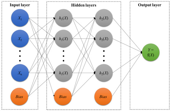 Gautam et al. [60] utilized linear regression (LR), multilayer perceptron (MLP), and KNN to estimate the production quantity of biodiesel from three independent variables of reaction duration, catalyst concentration, and methanol quantity/molar ratio. Notice that MLP can be illustrated as a feed-forward ANN, so that the weight between l and () layers () in Equation (4) is trained without feedback loops [58]. Figure 4 illustrates MLP with two hidden layers [61]. In Figure 4, all nodes in the hidden and output layers are neurons with nonlinear activation functions. Backpropagation is widely used for supervised learning in MLP. The learning process consists of four steps: (1) the sum of the product of inputs and their weights is computed; (2) a bias factor is added; (3) the sum with the activation function is fed into MLP; and (4) the output of the perceptron is achieved as its outcome [60].