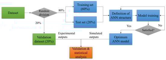 In general, the quality of biodiesel is evaluated in terms of density, viscosity, and cetane number. These properties play a crucial role in fuel combustion [62]. According to Rocabruno–Valdes et al. [63], ANN can be adapted to predict the density, dynamic viscosity, and cetane number of biodiesel from four independent variables involving the temperature, composition of methyl esters (C8:0, C10:0, C12:0, C14:0, C16:0, C16:1, C18:0, C18:1, C18:2, C18:3, C20:0, C20:1, C22:0, C22:1, C24:0), number of carbon atoms, and number of hydrogen atoms. Since ANN requires many data points for its training, the study collected 780 experimental points from different scientific articles. The collected data were randomly divided into a training set (60%), testing set (20%), and validation set (20%).