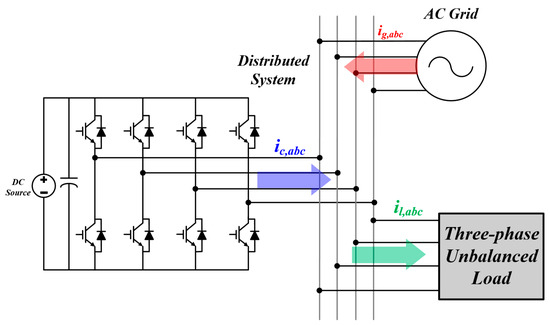 Figure 1 illustrates the scenario of an unbalanced load in the system connected to the inverter. When the inverter is not controlled, the load power is entirely supplied by the power grid. Such an unbalanced load causes distortions in the distribution system and deteriorates the overall power quality [25]. Figure 2 shows a vector diagram of the distorted current improved by the inverter. To address these issues, research has been conducted on the LUC method, which compensates for unbalanced loads. When the inverter compensates for the unbalanced loads, the current in the system is balanced. This LUC method comprises two parts: calculating the current reference to compensate for the unbalance current, and the current controller [24]. In this section, we describe the conventional method of calculating the current reference under an unbalanced load. Equation (1) mathematically describes the principle of current compensations.
