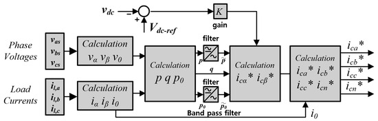 Figure 3 depicts the block diagram for calculating the current reference based on the instantaneous power p-q theory. Calculations based on the p-q theory remain effective in both the steady and transient states, providing rapid response characteristics even under transient conditions [11]. This method utilizes a band pass filter to compute the current reference using the AC power component. Inputs for the calculation are obtained by transforming the abc coordinates to the stationary coordinates α-β-0, which is represented in Equations (2)–(4) [13].