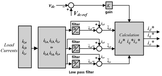 Figure 4 illustrates a block diagram for calculating the current reference based on the synchronous reference frame theory. To compute the current reference, the current values must be transformed from the abc coordinates to the dq0 synchronous coordinates. Equation (5) represents the formula for transforming the abc coordinate system into the dq0 coordinate system. When the load is in an unbalanced state, the dq0 current can be expressed by Equation (6). Using this represented current, the unbalanced current reference of the inverter can be computed [26,27]. In Equation (6), the current is divided into DC and AC parts. To obtain a DC current component, an LPF with a very low cut-off frequency must be used. By extracting the constant component of the current through the LPF, the current reference in dq0 coordinates can be calculated using Equation (7). However, the performance of deriving the current reference from an LPF-based synchronous coordinate system is constrained by the time delay introduced by the filter [10,21]. Here, and represent the constant and varying parts of the current, respectively.
