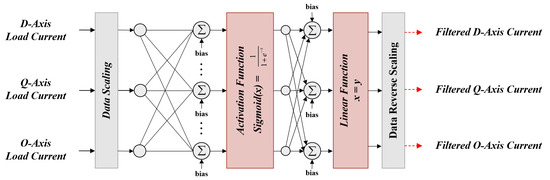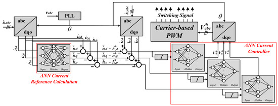 Figure 5 shows the control block diagram of the inverter, outlining the proposed approach for compensating the grid current under unbalanced load conditions. Initially, an ANN was devised to calculate the reference current and compensate for the unbalanced current. The ANN was fed with the synchronous coordinate values of the AC current as the input. In addition, three supplementary ANNs were established to control the phase current. A conventional carrier-based pulse width modulation method was employed to govern the inverter, based on the output derived from the ANN training.