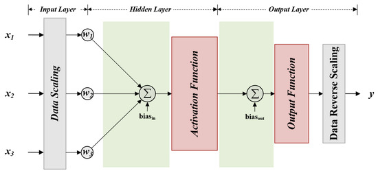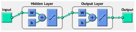 The ANN consists of three layers: the input, the hidden, and the output layers. The output of the activation function is formulated as the product and sum of the inputs, as expressed in the following equation, where , , , and are the minimum and maximum values of each sample of training input and output data, respectively.