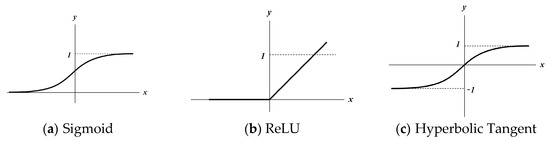 The activation function outputs large values for inputs above a certain threshold, without outputting small values. Owing to the characteristics of each activation function, they typically output values between 0 and 1 or between −1 and 1, necessitating the scaling of the input and output data. Although various activation functions exist, the three most commonly used functions include the sigmoid, the rectified linear unit (ReLU), and the hyperbolic tangent functions, which are represented in Figure 7.