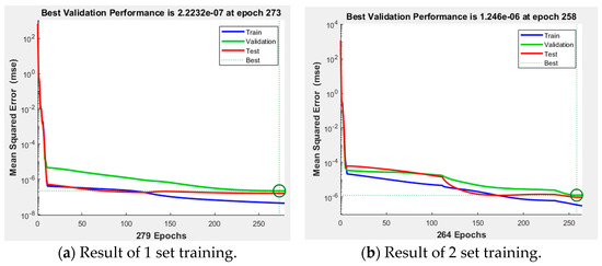 In this study, MATLAB’s Neural Fitting (nftool), from MathWorks, was utilized for the ANN training, and the structure of the ANN was configured as shown in Figure 8. When using the training toolbox, the user can select the ratio of training data, validation data to monitor the training progress, and testing data to evaluate the performance of the trained ANN. In this study, 100 test datasets for the q-axis current controller were used to determine the data sample ratio. The results are presented in Table 1 and Figure 9, where it can be observed that the presence of appropriate ratios of validation and testing data is essential for achieving high accuracy.