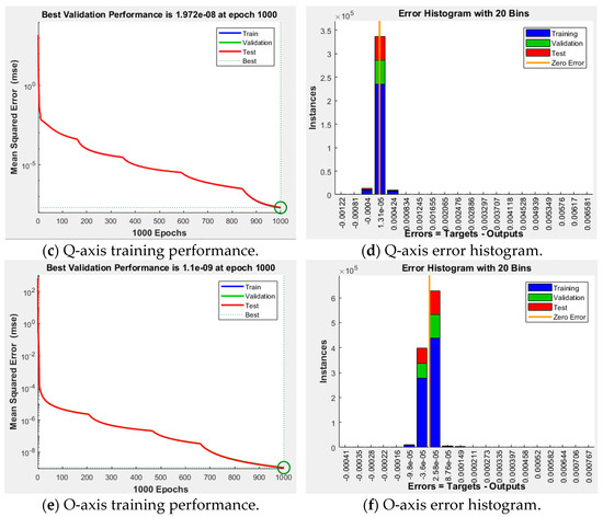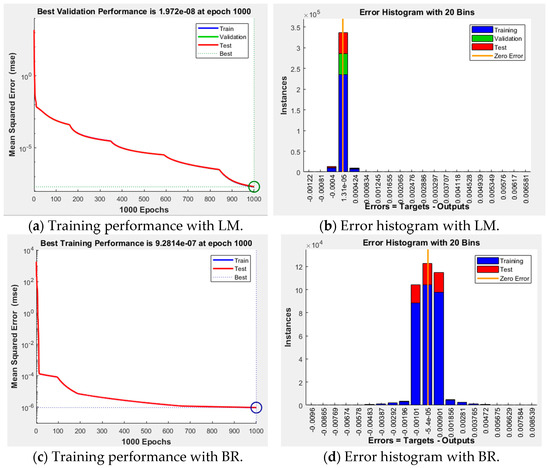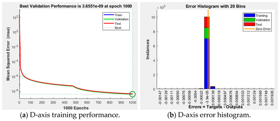 Figure 10 depicts the results of training the ANN current controller using three algorithms supported by MATLAB. All simulations involved 1000 iterations of identical training using the q-axis current controller dataset. When comparing the training performance and error histograms, as shown in Table 2, it is observed that the LM training algorithm exhibits the least amount of error.