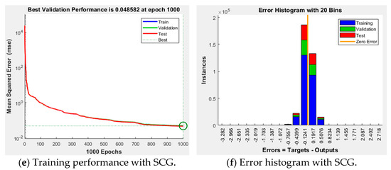 Based on previous results, the ratio of the test data was configured as follows: training 70%, validation 15%, and testing 15%. In this study, ANN was trained using the backpropagation method, and MATLAB provided three algorithms: the Levenberg–Marquardt (LM) algorithm, Bayesian regularization (BR), and the scaled conjugate gradient (SCG) method, which can be summarized as follows: