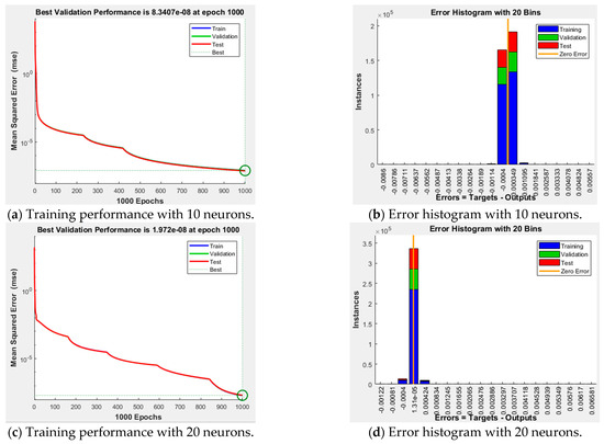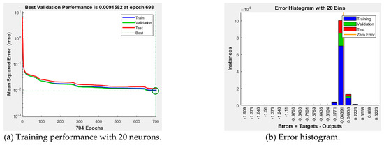 Figure 11 illustrates the training performance and error histogram based on the number of hidden neurons in the ANN using the q-axis current controller dataset. The training performance of the ANN with 30 hidden neurons is superior; however, the error histogram of the ANN with 20 hidden neurons indicates that the majority of errors are dominantly distributed in one area. Such dominant errors make it easier to compensate for the results of the ANN through the feedforward method. Based on the simulation results, we applied an ANN with 20 hidden neurons trained using the LM method.