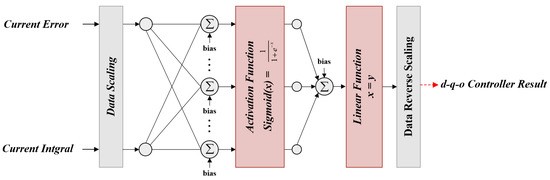 The structure of the ANN for the dq0 axis current controller in the case of a load unbalance is illustrated in Figure 14. The input of the ANN consists of the proportional and integral error values of each axis, whereas the output is composed of the PI controller of each axis. The ANN was configured with two inputs, one output, and 20 hidden neurons. Figure 15 shows the training results of the ANN for the current controller of each axis. Table 4 summarizes approximately 85,000 samples of each axis of the data used to train the ANN. Table 5 summarizes the training results of the ANN conducted in this paper.