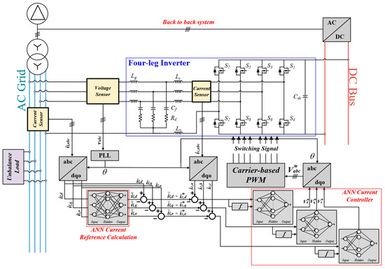 Harmonics arise owing to the discontinuous nature of rectifiers or AC/DC converters, causing malfunctions in precision control equipment and a decrease in power quality by reducing the power factor. Therefore, various approaches have been investigated to compensate for harmonics in power systems, focusing on mitigating their effects [3,4]. Reactive power arises from the use of inductive and capacitive load components, which can degrade the power quality by reducing the power factor of the system. Various methods for controlling reactive power in power systems have also been studied to improve the power quality [5,6]. Unbalanced power refers to situations in which the magnitudes and types of loads used in each phase are different, resulting in phase and magnitude imbalances in the current or voltage of the system. In particular, if voltage, current, and power imbalances occur due to an unbalanced load, they can cause power quality issues across power generation and distribution systems [7]. Awareness of the risks posed by unbalanced power is continually increasing, leading to a continuous increase in research aimed at minimizing the effects of unbalanced power [8]. Although LC filters can be used in power systems to compensate for unbalanced power, issues such as filter size and parameter selection arise [9]. Following the advancements in power electronics research, recently, the focus has shifted towards active power filters and load unbalanced compensation (LUC) to address harmonic distortions and non-linear loads, thereby improving the overall power quality of grid systems [10]. The fundamental approach in such compensation strategies involves integrating an inverter in parallel between the grid and the load to inject harmonic and unbalanced currents back into the grid [11]. As a result, elements requiring compensation, such as harmonics and unbalanced values, necessitate the computation of current references for the inverter, which acts as a compensating agent. Therefore, this study aims to investigate the process of determining current references using a specific methodology. Typically, the instantaneous reactive power theory method is employed [12,13]. However, this method has the disadvantage of being susceptible to noise. To address these limitations, stationary reference frame (STRF) approaches have been proposed, transforming the abc frame into a set of stationary coordinates of α-β-0 to mitigate unbalances [14,15]. Furthermore, various approaches based on the synchronous reference frame (SRF) have been proposed to alleviate unbalances by synchronizing with the voltage of the power system and transforming the abc frame into the dq0 synchronous frame [16,17]. Subsequently, research has been conducted to improve the performance of unbalanced power compensation by applying bandpass filters, high-pass filters (HPFs), and low-pass filters (LPFs) to STRF and SRF [18,19]. However, the filter-based method exhibits disadvantages in regards to time delay [20,21]. In power electronics-based approaches, research has also been conducted to apply artificial neural networks (ANNs) to replace controllers [22,23], and as well as to employ ANN-based nonlinear compensation in active power filters [24].