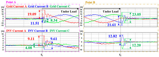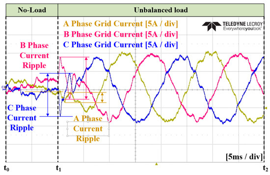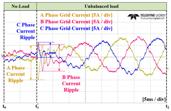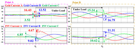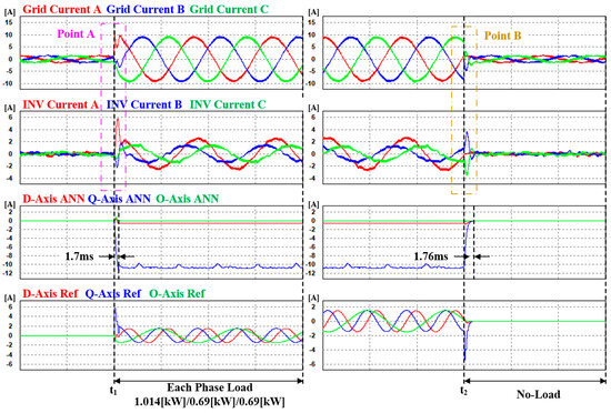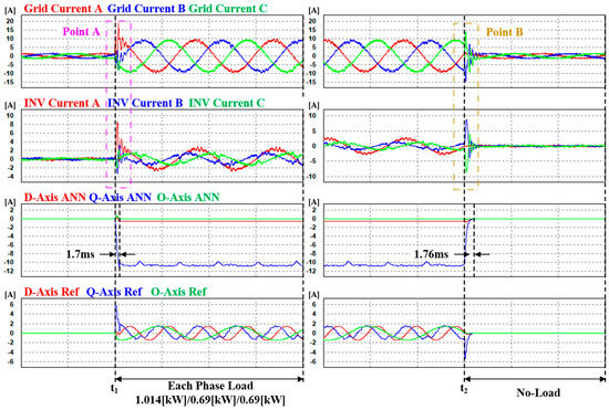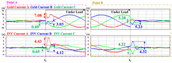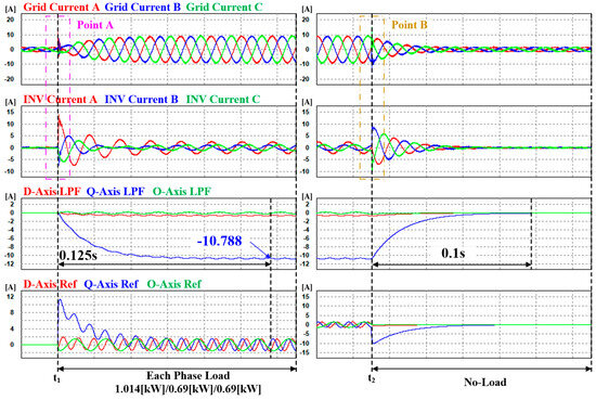 The conventional method employs a synchronous reference frame LPF-based current reference calculation. This approach calculates the magnitude of the unbalance value using an LPF and compensates for the unbalanced current using an inverter with a PI current controller. Figure 18 shows the simulation waveforms obtained using the conventional method. At time , a load is applied during the simulation, and at time , the load is removed. The load was applied with 1.014 kW in phase A, 0.69 kW in phase B, and 0.69 kW in phase C, making an unbalanced current situation. The waveform depicts the current in the distribution system and the compensating phase current provided by the inverter. The next waveform represents the magnitude of the unbalance component calculated using the LPF. The final simulation waveform depicts the current reference for the compensation performed by the inverter. The simulation waveform on the left represents the situation in which the system transitions from a no-load to a moderate load condition, while the simulation waveform on the right represents the situation in which the system transitions from a loaded state to a no-load condition. The first waveform in Figure 18 represents the grid current under unbalanced load conditions. This current slowly follows the load variations owing to the delay in determining the unbalance magnitude using the LPF, as depicted in the third plot. When transitioning from a no-load to a loaded condition, it takes 0.125 s to reach an average q-axis current value of −10.788 in a steady state. Similarly, when transitioning from a loaded to a no-load condition, it takes 0.1 s to reach a steady state. Figure 19 shows enlarged waveforms of points A and B in Figure 18. The ripple magnitudes and total harmonic distortion (THD) of each phase current are listed in Table 7. However, for Point B, the ripple in the phase A current is negligible and is thus not indicated separately.