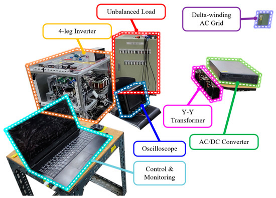 Figure 24 shows the experimental configuration used to verify the proposed ANN-based compensation method under unbalanced load conditions. The parameters of the three-phase the four-leg inverter and the three-phase unbalanced resistance load are listed in Table 6. In the experiment, the current compensation method was applied to a four-leg inverter in a distributed system under unbalanced load conditions using an ANN.