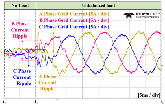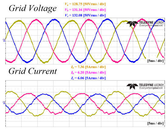 The experiments were conducted in three cases, similar to the method used in the simulations. The AC voltage was maintained by the grid, while the DC voltage was controlled by the AC/DC converter connected in a back-to-back system linking to a delta-winding grid. The laboratory grid was in a delta-winding configuration, so three single-phase transformers were connected in a Y-Y configuration to perform the four-wire experiments. The experiments were conducted only on the no-load to loaded state sequence. Figure 25 depicts the voltage and current waveforms of the secondary side of the Y-Y transformer. Since the experiments were conducted in the laboratory, the grid was limited to the operation of the unbalanced experiments, and there is slight distortion in the voltage due to the presence of harmonics caused by the characteristics of the Y-Y transformer. The switching frequency of the four-leg inverter is 10 kHz, and the control period is 5 kHz, with experiments conducted accordingly.