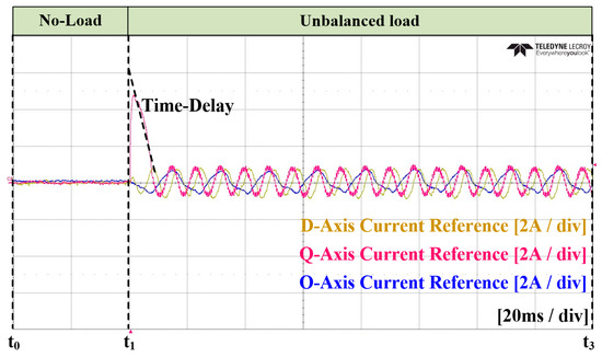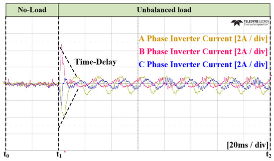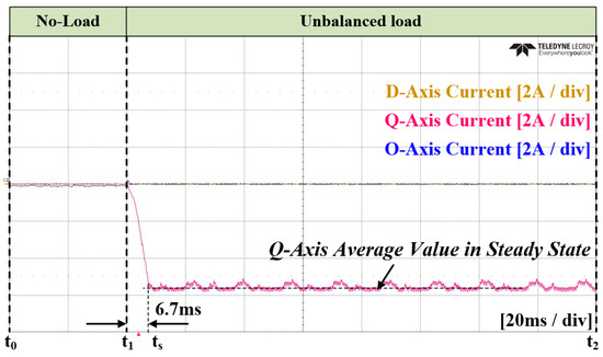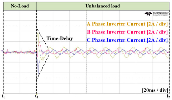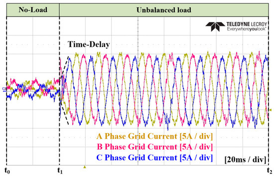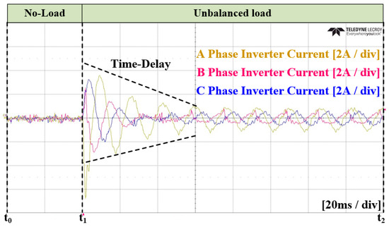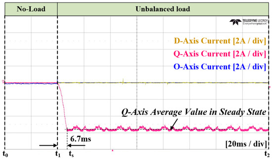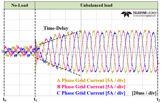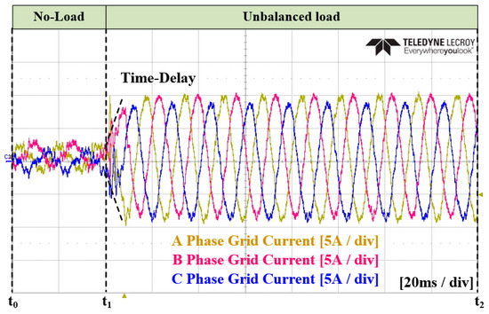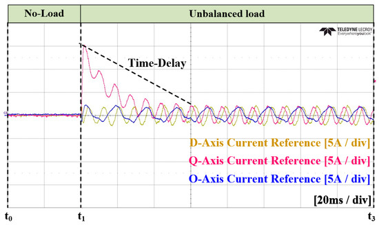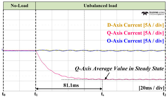 In the Case 1 experiment, the conventional method was applied. The unbalanced current reference was calculated based on LPF, and a PI current controller was applied. Additionally, the transition to the load state occurred at time . Figure 26 and Figure 27, respectively, illustrate the grid current and converter current. Figure 28 represents the amount of unbalance in the dq0 axis using LPF. At time , as shown in this figure, it reaches the average value, which takes approximately 81.1 ms. Figure 29 depicts the current reference in the dq0 axis generated by the calculation. Figure 30 and Figure 31 show an enlarged waveform of Figure 26 and Figure 27. The experimental results indicate that it requires more than several cycles to reach the overall steady state.