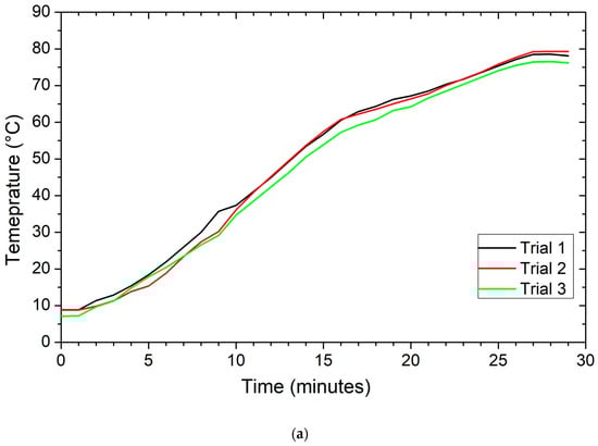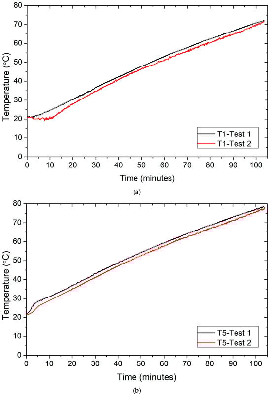 On the other hand, the reliability test is performed, where the “boiler only” test is repeated two times with similar ambient conditions, starting water temperature, and ending water temperature. Graphs in Figure 5a–c show reliability tests for T1, T5, and T6, while graph in Figure 6 shows the temperature difference in reliability Tests T1, T5, and T6. This temperature difference values for thermocouples have an average of 1.73 °C during the experiment.