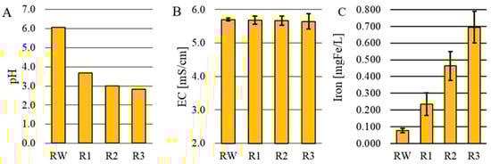 pH (A), electrolytic conductivity (B), and iron concentration (C) in raw wastewater (RW) and treated wastewater (R1–R3).