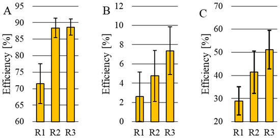 Efficiency of total phosphorus removal (A), total nitrogen removal (B), and total organic carbon removal (C).