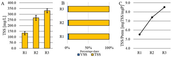 Amount of sediment discharged from the reactor (A), the proportion of volatile suspended solids (VSS) in total suspended solids (TSS) (B), and the amount of mgTSS per mg of removed phosphorus (C).