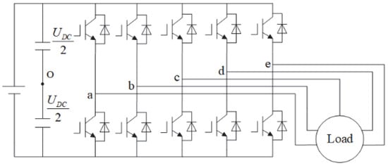 In Figure 1, the topology of the five-phase inverter employs a full-bridge structure, with a DC bus voltage denoted by . The a-e represents the five bridge arms of the five-phase inverter. Each bridge arm consists of two power transistors, with the switching operations controlled by modulation signals.