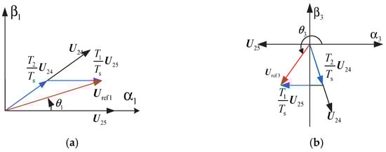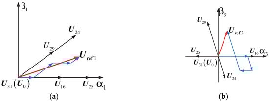 Voltage vector synthesis diagram of NTV-SVPWM. (a) Vector synthesis in subspace. (b) Vector synthesis in subspace.