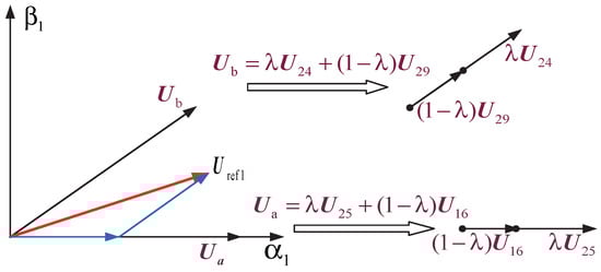 The synthesized vector SVPWM shown in Figure 3 simplifies the process of calculating the action time of basic vectors. Two basic vectors in the same direction are synthesized as a new basic vector called , namely, . During the process of synthesis, the number of CDFs is decreased from 4 to 3. In Figure 3, the black arrow represents the basic voltage vector, white represents the new voltage vector synthesized by two basic voltage vectors in the same direction, the red arrow represents the reference voltage vector, and the blue arrow represents the projection of the reference voltage vector on the two new voltage vectors.