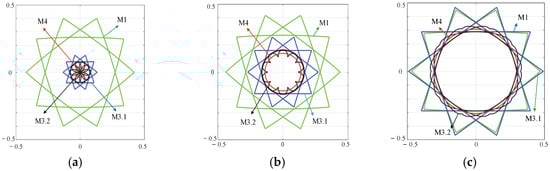 Figure 7b,c display that shapes of trajectories in M3.1 are identical, while those of M3.2 are different. This can be attributed to the fact that the amplitude of the newly synthesized basic vector in M3.2 changes continuously with the change in the reference voltage vector’s phase. The amplitude of the accompanying vector in M3.2 is smaller than that of M3.1 but at the same time exceeds that of M4.