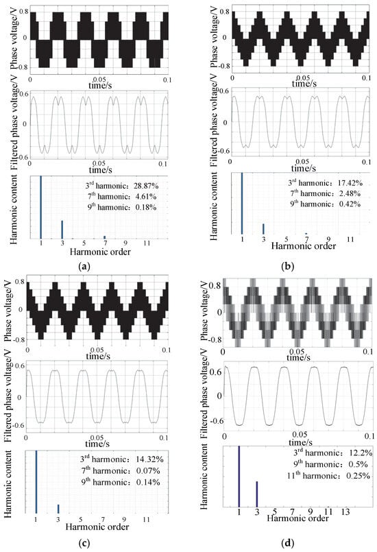 Output phase voltage and its low-frequency spectrum analysis (m = 1.23). (a) M1. (b) M3.1. (c) M3.2. (d) M4.