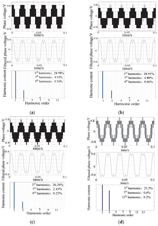 Output phase voltage and its low-frequency spectrum analysis (m = 1.15). (a) M1. (b) M3.1. (c) M3.2. (d) M4.