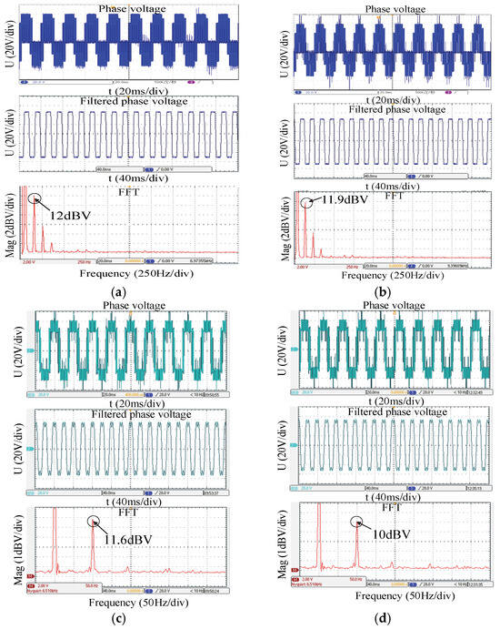 Figure 12 and Figure 13 exhibit the output phase voltage waveforms, corresponding filtered waveforms and the Fast Fourier Transformation (FFT) for all the strategies at two different modulation ratios. It can be observed from the experimental results that the output phase voltage waveforms all contain a certain amount of low-order harmonic content, thus leading to the distortion of waveforms. Among all the harmonic content, the third harmonic content accounts for a large proportion, and it increases with the increase in the modulation ratio. Comparing four waveforms with the same modulation ratio, M1 results in the largest amount of the third harmonic, while M4 results in the lowest. When m is up to 1.23, the third harmonic content of all is more than 10 dBV, which demonstrates that the superiority of the FDF strategy almost disappears when the modulation ratio is large.