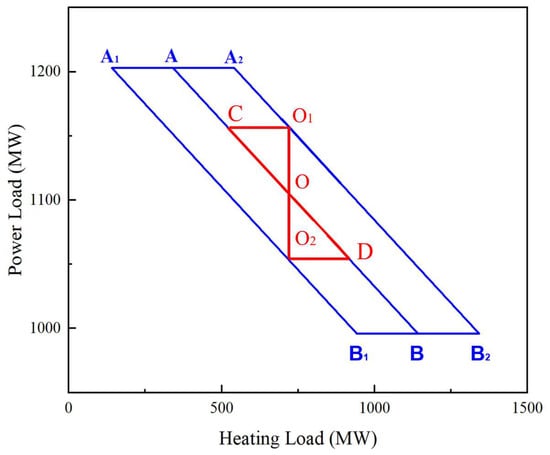 For the CHP nuclear unit, the coupling relationship between the unit’s power load and heating load is the linear relationship on the premise of a constant main steam flow, as shown in Figure 3.