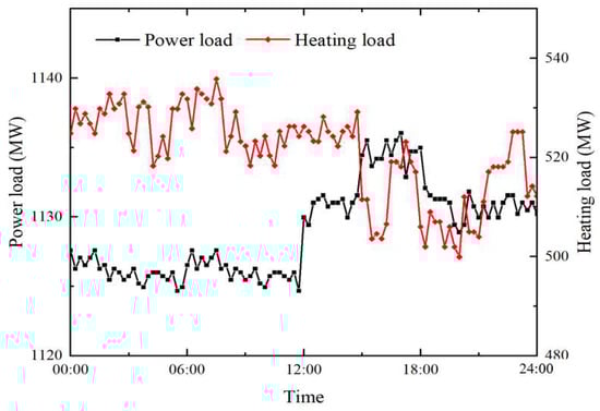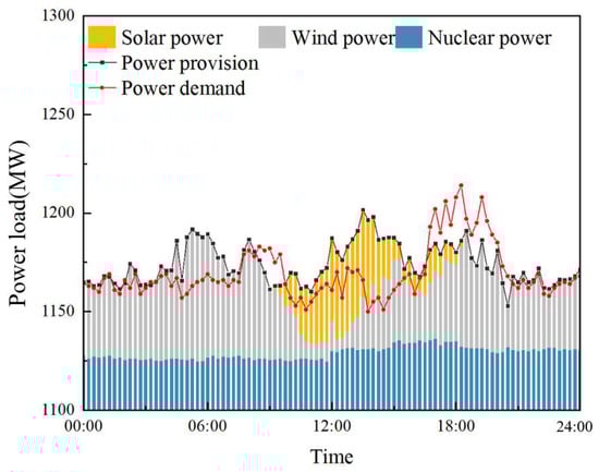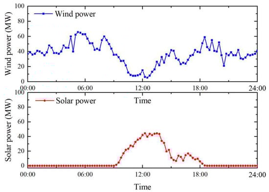 The energy system model studied consists of a wind power generation source, a solar photovoltaic power generation source, and a CHP nuclear power unit with TST. The real-time heating load and power load of the reference cogeneration unit on a typical day were selected as the boundary. Figure 5 shows the wind power data and the solar power data, and Figure 6 shows the real-time heating and power load of the reference unit.