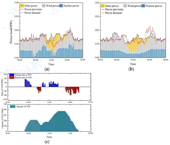 In Figure 8, two types of strategies are also compared. The novel load adjustment strategy analyzed in this paper is shown in Figure 8a. The traditional nuclear peaking strategy, i.e., the “12-3-6-3” mode, is shown in Figure 8b. It is evident that the load adjustment strategy studied in this paper is more flexible compared to the traditional strategy, which can more effectively follow the change in the load demand. Figure 8c shows the detailed operation strategy of the TST. From the general trend, it can be seen that the TST performs several heat storage and discharge processes in the case day to reach the final optimization. It is shown that the heat storage processes are at 5:00–6:45 and 12:00–14:30, and the discharge processes are at 8:30–9:30 and 16:45–20:30, and the reference unit totally contributes 335 MWh of peak electricity within the reference day.
