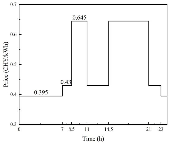 With the reduction in coal-fired units in the future, there is wide scope for nuclear units participating in the electricity market to use their flexibility to enhance profit. Although the domestic nuclear power generation units are not yet integrated into the spot market, as the main force of new energy consumption in the future, integration into the spot market is the general trend. The standard of electricity price adopted in this paper is from the “Notice on Issues Related to Improving the Feed-in Tariff Mechanism of Nuclear Power” issued by the National Development and Reform Commission on 15 June 2013, which stipulates that new nuclear power generation units implement the benchmark feed-in tariff policy, and the national benchmark feed-in tariff for nuclear power is 0.43 RMB/kWh. The time-of-use (TOU) electricity price is one of the common pricing mechanisms and is currently being widely adopted in China. According to the document issued by Shandong Development and Reform Commission (Lu Development and Reform Price [2021] No. 893), the TOU electricity price of Shandong Province is shown in Figure 9, which is used in this study.