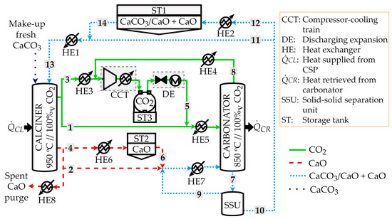 The CaL TCES process scheme to assess the effects of the partial separation of carbonated material is shown in Figure 1. The storage tank (ST) system was included between the two main reactors (i.e., the solar calciner and carbonator) with an intermediate heat exchange (HE) network for preheating or heat recovery with 2% energy losses. The reactors were based on fluidized bed technology, and CO2 was the fluidization gas used to perform the heterogeneous reactions of calcination and carbonation. The nominal power of the solar calciner was set to 100 MW. When solar energy was available (defining CL as the heat power required by the calciner), the endothermic calcination reaction occurred at 950 °C and 100% pure CO2 atmosphere, forming CaO and CO2 as the products (the reaction was completely shifted towards the products). The gas and lime (CaO) particles leaving the calciner could be sent to independent storage tanks (i.e., ST2 for CaO and ST3 for CO2) or be fed to the carbonator (streams 1 and 2, respectively). The CO2 stream directed to the storage (stream 3) was sent to a compressor and cooling train (CCT) to reach the ST3 storage conditions (35 °C and 75 bar). Before the CCT process, the heat exchanger named HE3 cooled the CO2 stream from 950 to 50 °C. Moreover, CO2 storage was required to release the energy stored in CaO in the carbonator later. The CaO stream was cooled from 950 to 200 °C in the HE6 to be sent to the ST2 storage tank (stream 4) or fed to the carbonator (stream 2). When energy recovery was required in the carbonator (CR is the related power), CaO and CO2 were fed to the carbonator from the storage tanks or calciner. The HE5 heat exchanger preheated up to 850 °C the CO2 streams from (i) the calciner at 950 °C (stream 1) and (ii) the discharging expansion (DE) process (15 °C) after the ST3 storage tank (stream 5). The HE7 heat exchanger preheated up to the carbonator temperature (850 °C), the mixture of CaO particles from the calciner at 950 °C (stream 2), and the ST2 storage tank at 200 °C (stream 6). The non-complete exothermic heterogeneous carbonation reaction involved finding partially carbonated material (stream 7) and unreacted CO2 (stream 8) as the carbonator outputs [57]. The unreacted CO2 (stream 8) was sent to the CCT to be stored at ST3 after a heat recovery in HE4 from 850 to 50 °C. The partially carbonated material consisted of a mixture of partially carbonated particles (CaO core with a CaCO3 shell) and less carbonated particles (mostly based on the unreacted CaO). For the first time, Pascual et al. [55] proposed the inclusion of a new equipment piece named the solid separation unit (SSU) to classify the partially carbonated material after the carbonation step. A total separation of more carbonated material from the lesser one was simulated by Pascual et al. [56] to assess the maximum energy and size savings compared to a reference case without any separation. The recirculation of the fewer carbonated particles into the carbonator was assumed, reaching a size reduction of up to 74% and energy savings of up to 28% when the SSU was implemented [56].