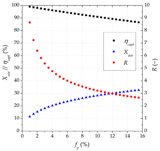 Carbonation modeling was first implemented on the CaL TCES scheme with the total separation of the carbonated material under nominal conditions as the base reference. A sensitivity assessment (Figure 2) was carried out to set the proper spent material purge fraction (fp; expressed vs. the recirculating sorbent, molar basis) to reach a carbon capture efficiency close to 90% and a suitable value for R. The value of R was subjected to the defined input variables of the CaL TCES system [51] including the (i) nominal power in the calciner (CL), CaO purge fraction (fp), and analogous storage and discharge fractions of CO2 and CaO between the storage tanks and reactors, defining the CaO and CO2 fractions as the ratio of the mass flow rate conveyed to/from the storage tanks and the maximum mass flow rate that could be stored [55].