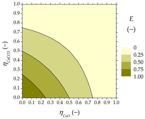 The specific thermal energy variables for consumption and storage were calculated using Equations (9) and (10), respectively, shown in Figure 4 as a function of . Both parameters assume the most advantageous value when the circulation between the reactors of the less carbonated material is zero, with the lowest energy demand (1.9 MJ/kg CaCO3) and the highest energy storage (3.4 MJ/kg CaO).